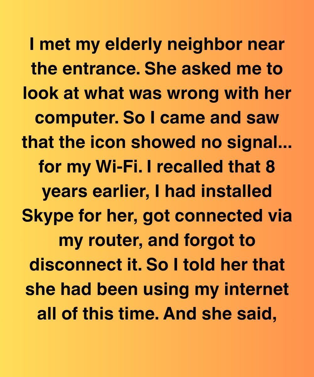 For 8 years, my elderly neighbor unknowingly used my Wi-Fi. When I finally told her, we bonded over tea, cassava cake, and stories. Later, she needed eye surgery and I helped raise funds. Over time, we became like family. When she passed away, she left me her condo, savings, and a small plot of land—her way of saying I mattered. Sometimes, kindness and connection are the greatest inheritance.
