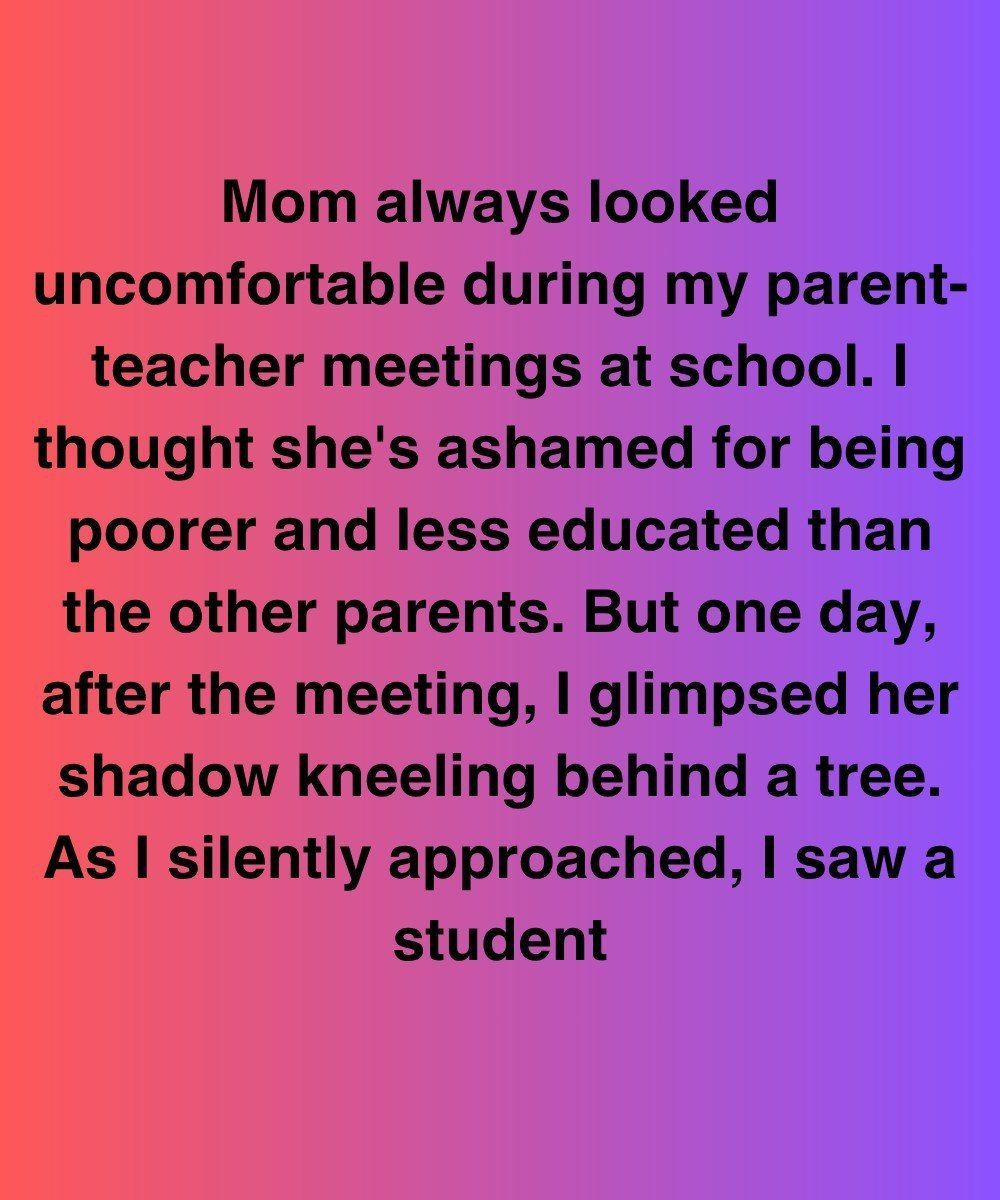 Mom always seemed nervous at my school meetings. I once thought she was ashamed of being “less” than other parents. Then I saw her behind a tree, taking sandwiches from a little boy. At first, I panicked—was she stealing? But the boy was smiling, and Mom treated him kindly.